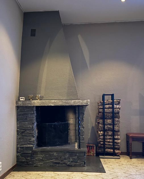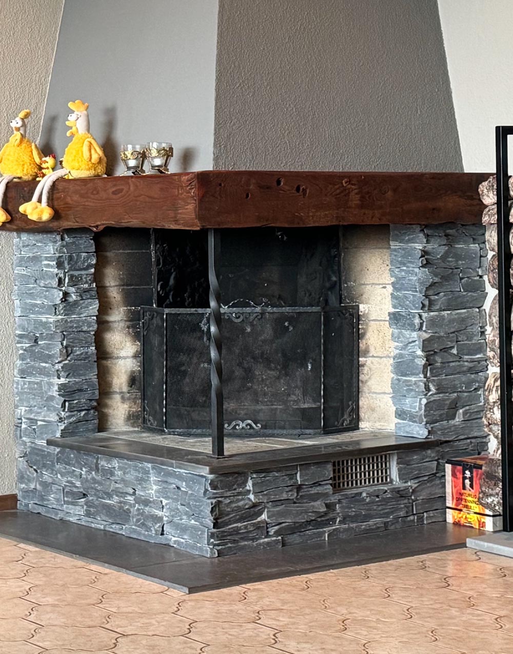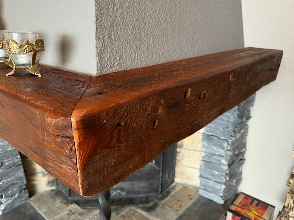 Peishylle som dekker over den opprinnelige murkanten på peisen. Laget i grov rekved som er beiset og lakkert.