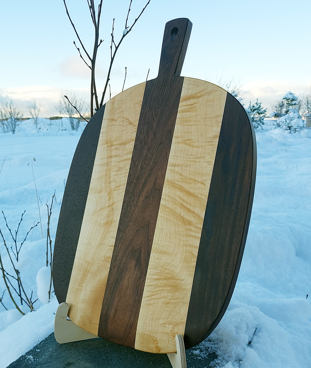 Pizzafjøl laget av valnøtt og lokal flammelønn fra Valderøya. Fungerer også fint som tapas- eller ostebrett.