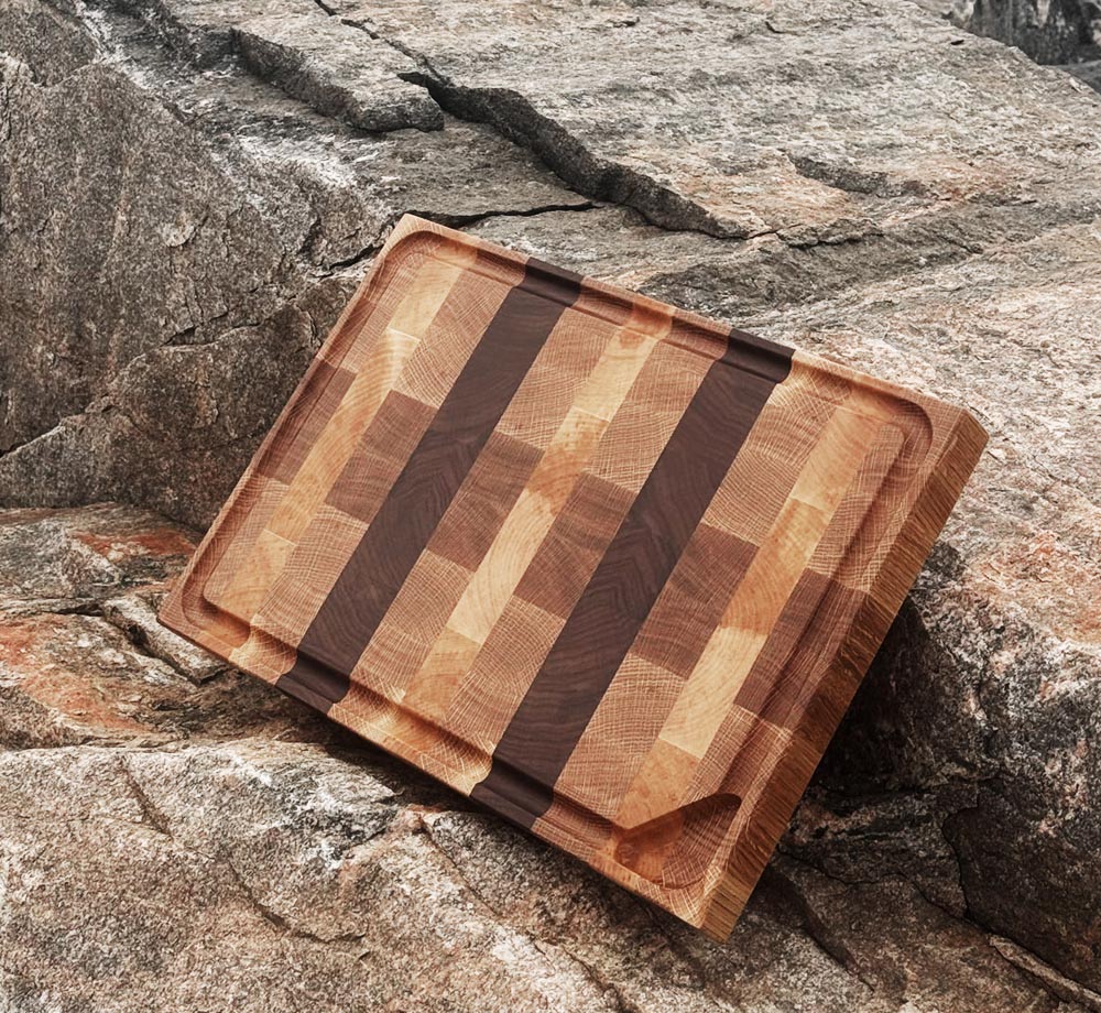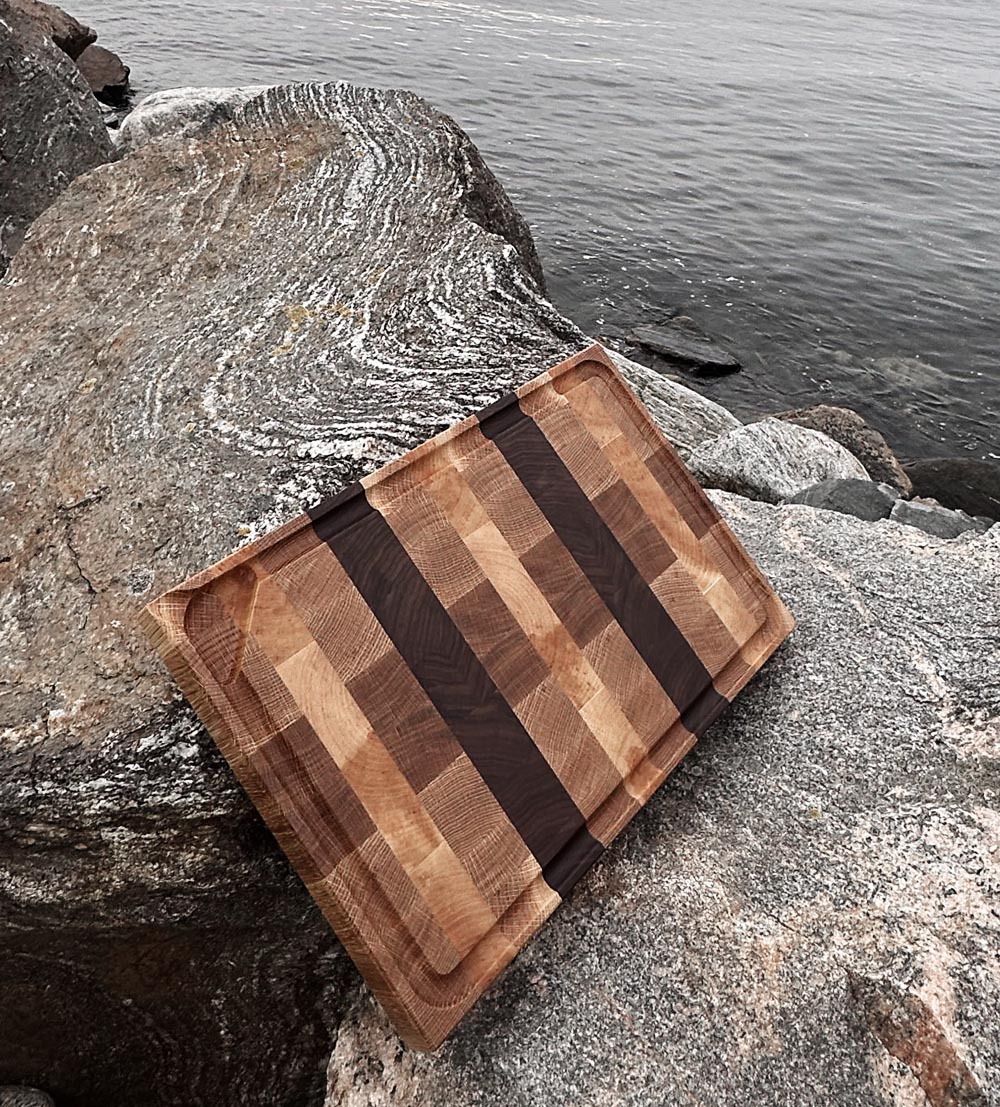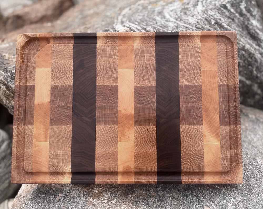 Skjærefjøl i eik, valnøtt og bjørk endeved.