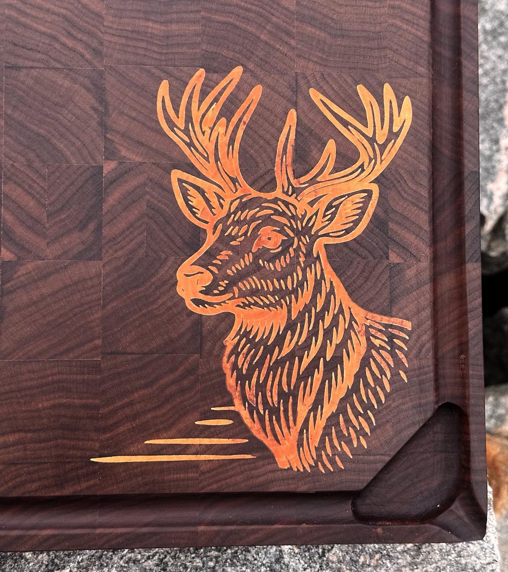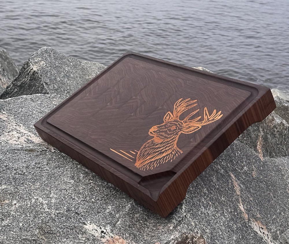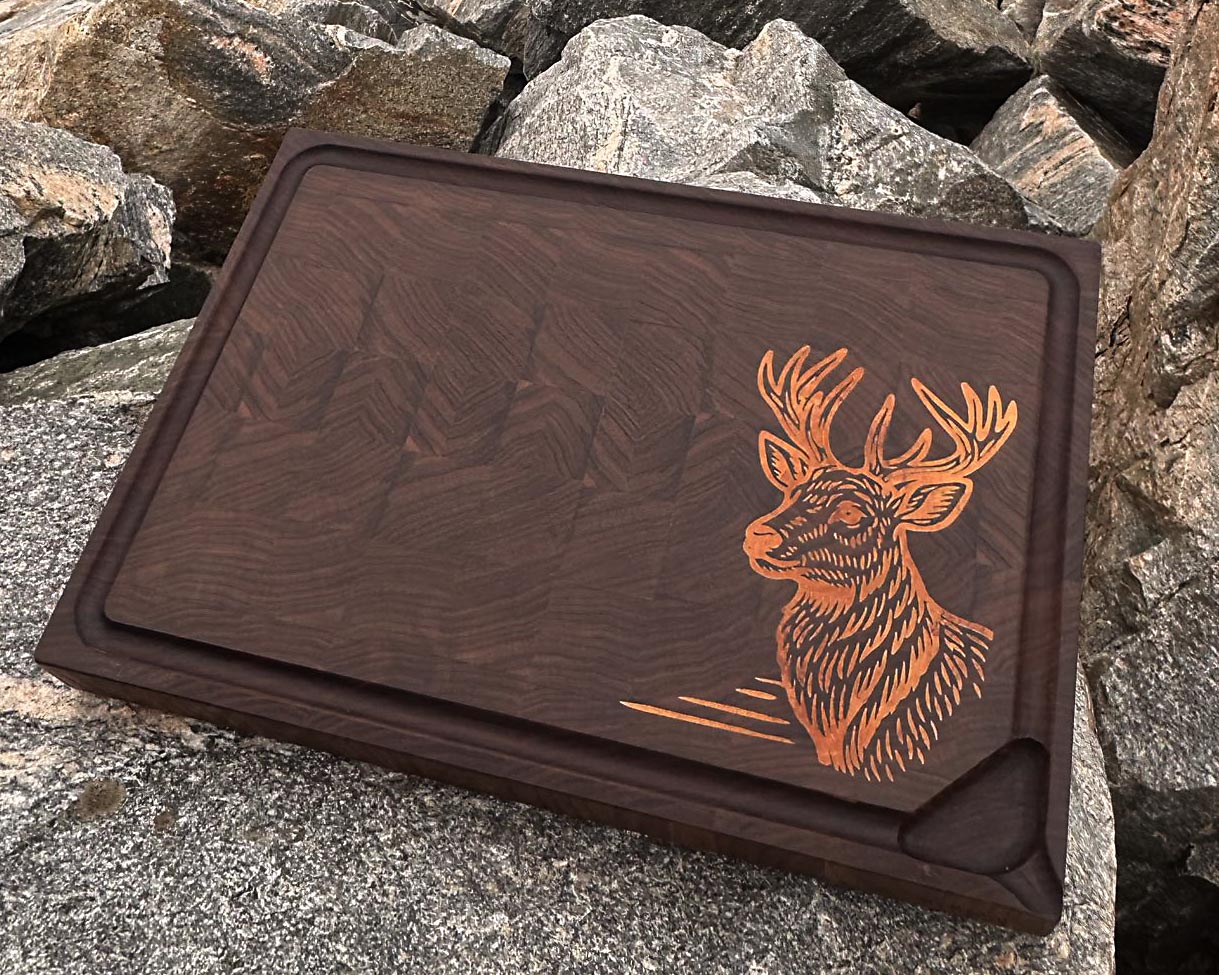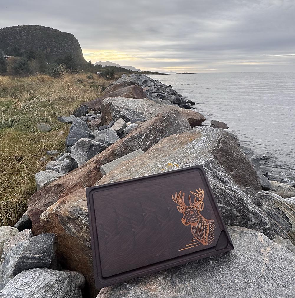 Skjærefjøl i eksklusiv valnøtt med innfelt hjortemotiv i lokal bjørk.