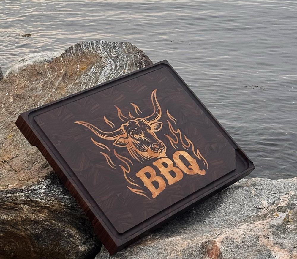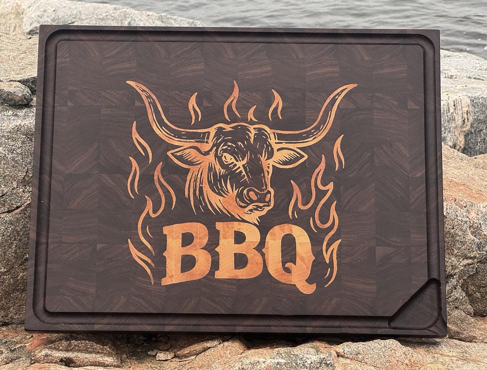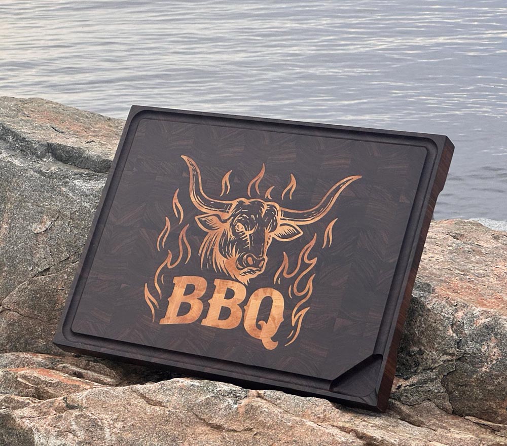Stor eksklusiv skjærefjøl i valnøtt med innfelt BBQ-motiv i bjørk